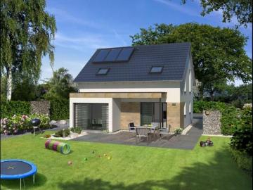 Einfamilienhaus Family L Das behagliche Family-Haus mit Satdach punktet mit einem gut durchdachten Grundriss. Der offen gestaltete Wohn-/Ess- und Kochbereich ist lichtdurchflutet. Ein praktischer Hauswirtschaftsraum ist direkt neben der Küche platziert. Komplettiert wird das Raumangebot im Erdgeschoss mit einem Gäste-WC, das optional auch als Duschbad ausgeführt werden kann, einer Diele und einem Haustechnikraum. Im Dachgeschoss des Hauses sind zwei schöne Kinderzimmer, ein Elternschlafzimmer, ein Flur und ein Familienbad untergebracht. Die Lage der Treppe und des Haustechnikraumes sind fixiert. Objektart: Einfamilienhaus, 1,5-geschossig Dachform: Satdach Kniestock: 0,75m