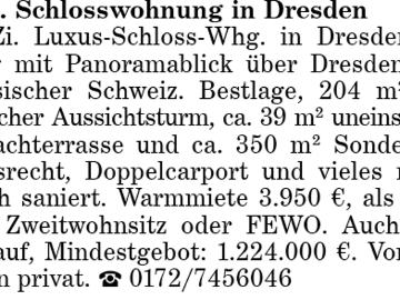Exkl. Schlosswohnung in Dresden 5,5-Zi.-Luxus-Schloss-Whg. in Dresden am Hang mit Panoramablick über Dresden und Sächsische Schweiz. Bestlage, 204 m², zusätzlicher Aussichtsturm, ca. 39 m² uneinsehbare Dachterrasse und ca. 350 m² Sondernutzungsrecht, Doppelcarport und vieles mehr. Frisch saniert. Warmmiete 3.950 €, als Erst- oder Zweitwohnsitz oder FEWO. Auch zum Verkauf, Mindestgebot: 1.224.000 €. Von privat an privat..: 0172/7456046