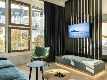 The compley renovated four-room apartment on the mezzanine floor of a red brick old building has bright, freshly refinished plank floors. The bathrooms are tiled in white and in the kitchen a vinyl floor was laid. There are two corridors in the apartment, from each of which the living room and the bedroom as well as a guest toilet or the dining room and the study as well as the mshower bath can be reached. In the center of the apartment is a bright new fitted kitchen with seating. The kitchen has a fridge-freezer combination, a dishwasher, a stove with ceramic hob, a microwave and a washer-dryer and is fully equipped: in addition to dishes, cutlery, pots, etc there are also a toaster, kettle and coffee maker