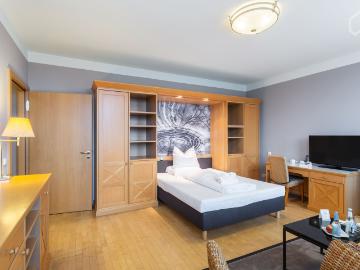 Situated in a residential area in the heart of Frankfurt, between the banking district and pedestrian area, the doorman offers self-catering apartments with modern architecture and excellent facilities. We welcome you 365 days with our value: Feels like coming home. The spacious apartments provide a comfortable and exclusive living and working environment in Frankfurt. All apartments are soundproofed with a writing desk, TV and free WiFi. Bright apartments with room-high panoramic windows, parquet flooring and fully equipped kitchen with a kettle and a coffee machine. The apartments also feature a large private bathroom and a balcony. A small breakfast station is available Monday to Friday next to the Reception. Additionally, are private Parking spaces available upon request. In our Studio Apartment you can make yourself a home on 40m² and enjoy the life in the city! The apartments are within walking distance of Frankfurt's main shopping streets, bars, restaurants and tourist attractio