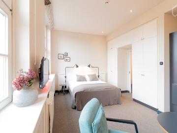 Our guests can expect in all apartments fully equipped pantries with stove, Nespresso machine, refrigerator, and microwave to be able to comfortably self-sufficient. Beds and sofas of high quality, as well as bathrooms in modern design. Each floor is accessible by elevator. Each apartment is equipped with free SAT-TV and WLAN. The floor may vary depending on availability. Our apartments are centrally located and only a few minutes' walk away from the Außenalster lake. Restaurants, a petrol station, and shops for daily needs are in the immediate vicinity. The Mundsburg underground station can be reached by foot within 5 minutes. Unfortunay, these are turbulent times. Enjoy the intimacy and security of a private apartment with its own kitchenette and self-catering, without having to forego the advantages of concierge + cleaning service. No crowds in the lobby and restaurant, therefore more security for you! Take good care of yourself. Your temporary home!