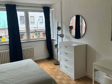 English: New garden - architectural monument with modern comfort The charisma of an architectural monument is combined with the dreamy ambience of a park-like estate. Shopping facilities, restaurants, doctors, cafés, park and fitness club in the immediate vicinity. Tram and bus connection in 100 m distance (among other things direct connection in approx. 10-20 minutes to the main station as well as airport and city center). Real wood parquet, stone floors, furnished Corridor and entrance area (parquet flooring), living and sleeping area (parquet flooring), kitchenette with wall shelves made of steel, new designer sofa bed MULTY by ligne roset, wooden windows/bar windows bathroom (stone floor) with spacious bathtub, Grohe fittings walk-in wardrobe/ storage room (stone floor) Balcony (teak) with view of a park-like property evision, cable connection Video and intercom system Parking space available on request Wifi is not available. We would organize a Giga Cube for you, but only with a s